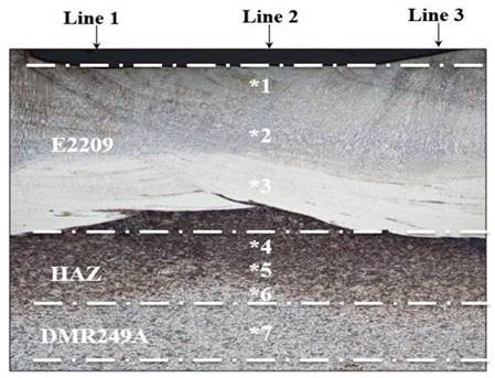 In this research study, the locations of actual chemical data are obtained at 3 mm from the fusion line to indicate/determine the alloying element segregation/migration. The geometrical plotting method was employed to estimate the area of dilution between the two materials. Figure 4 shows the actual dilutions obtained in the range of 30.98% and 33.14% for as-weld and heat treated samples nos. 1 to 5. The samples nos. 6 to 9, have undergone high temperature heat treatment at 1050 °C with rapid water quenching and their micrographs showed the disappearance of the heat affected zone therefore dilution was invisible.