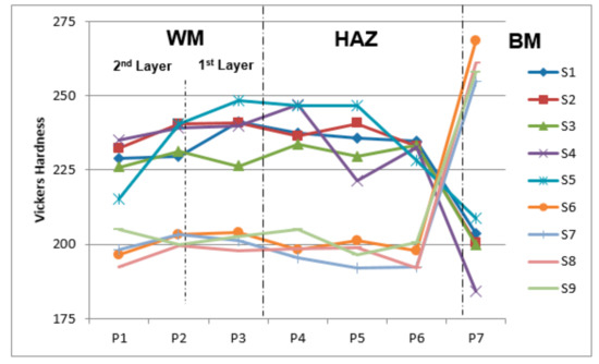 Comparison of macro-hardness in the cross-section area.