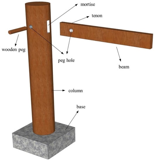The SMTJ/WP is a special joint consisting of a tenon, a mortise, and a wooden peg, with no adhesive involved and the wooden peg inserted in the middle of the joint to lock the tenon, as shown in Figure 2. In contrast to the case of an SMTJ without a wooden peg, the tenon is inserted into the mortise and then locked with the wooden peg, which can effectively prevent the tenon from being pulled and damaged and thus guarantee the structural integrity. When a structure is subjected to a horizontal load, the SMTJ/WP can withstand a certain bending moment and produce a certain rotation, which is similar to that of MTJs without wooden pegs [14,19,20]; thus, it consists of a semirigid joint between the rigid and hinged connections.