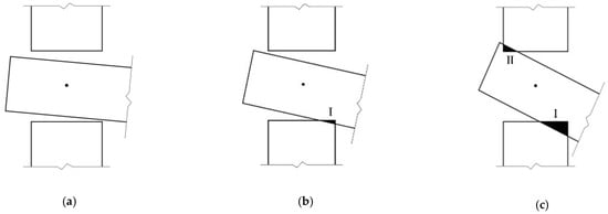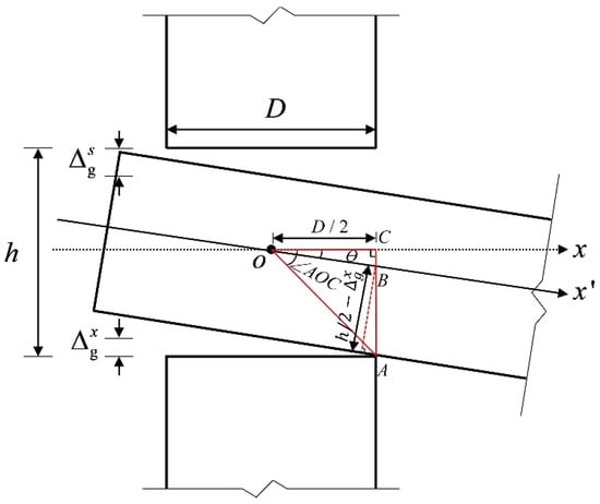 At the initial loading, the tenon is in the free rotation state from the start of rotation until critical state I, as shown in Figure 7. Based on the assumptions and geometric relations, the free rotation of the joint can be obtained through the following analysis: