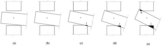 Some scholars [17] have studied the working state of penetrated mortise-tenon joints with gaps under forward and reverse loading and obtained the evaluation conditions for the working states of the MTJs. Referring to these research ideas, this paper gives the evaluation criteria of the working states for the SMTJ/WP with gaps. Taking the forward rotation as an example (assuming , the same as below), in the initial rotation stage, the joint is in the free rotation state, as shown in Figure 6a, due to the existence of the joint gap. As the rotation increases, the lower surface of the tenon is in contact with the edge of the mortise, reaching critical state I, as shown in Figure 6b. When the bottom of the tenon is in close contact with the mortise, the bottom region I of the tenon and the mortise undergo significant compression (compression state I), as shown in Figure 6c. As the rotation continues, the upper surface of the tenon is in contact with the edge of the mortise, causing the joint to reach critical state II, as shown in Figure 6d. As the external load continues to increase, in addition to the compression between the bottom region I of the tenon and the mortise, the top region II of the tenon and the mortise also compress against each other, causing the joint to be in the compression state (compression state II), as shown in Figure 6e. Therefore, the working states of the joint are divided into free rotation, compression state I, and compression state II. In addition, Figure 6c,d show that the rotation at which region I enters the plastic state is not necessarily the same as the rotation corresponding to critical state II, so there may be two working states (elasticity and elasto-plasticity) for the wood in region Ι in compression state Ι. Figure 6e shows that under the same rotation, the compression area of the wood in region I (or region II) varies, and the rotation corresponding to the onset of the plastic state is also different. Therefore, compression state II can be divided into multiple working states.