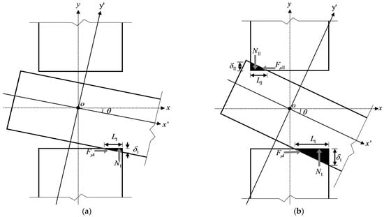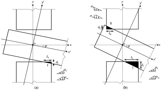 When , the lower part of the tenon and the mortise are in contact with each other, and the tenon is in the compression state I as shown in Figure 8a. Based on the geometric relations, the height of the compression region I in the lower part of the tenon can be obtained as follows: