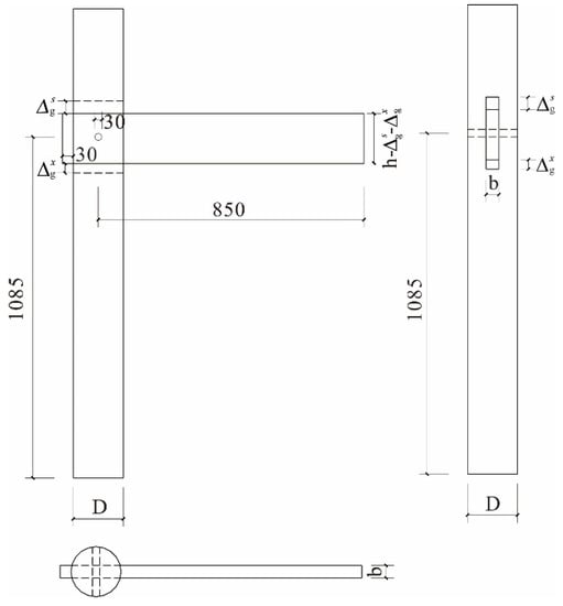 The detailed dimensions of the SMTJ/WP. Note: and are the gaps between the upper and lower surfaces of the tenon and the mortise, respectively; D is the diameter of the column; h is the height of the mortise.