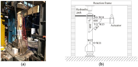 The quasi-static loading method was adopted in this experiment, which was conducted at the State Key Laboratory of Subtropical Building Science at the South China University of Technology. The vertical load at the top of the column was applied by a hydraulic jack and remained constant during the entire loading process, and the cyclic loading at the beam end was applied by an MTS hydraulic actuator. The columns in traditional wooden houses generally stand directly on the foundation stone, and the column foot joint can be approximately treated as a hinge joint [23]. Therefore, in this experiment, the bottom of the column was fixed onto the ground by means of a one-way hinge support [24]. To avoid out-of-plane instability which may occur during the experiment, lateral supports were set outside the plane of the specimen [23]. The specific loading device is shown in Figure 11. The beam end load and the corresponding vertical displacement were measured by the load and displacement sensors of the MTS hydraulic actuator. Linear variable differential transducers (LVDTs) were placed on the inner side of the column above and below the beam end (WJ3 and WJ4, respectively, in Figure 11b), so that the rotation of the joint was measured by the ratio of the difference between the readings of the two displacement LVDTs to the vertical distance between the two LVDTs. A draw-wire displacement sensor (LWJ in Figure 11b) was arranged on the side of the column and at the bottom of the beam to calibrate the rotation measurement of the joint.