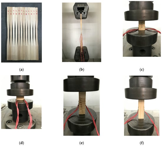 Parameter test of wood physical and mechanical properties: (a) tensile specimen; (b) tensile test; (c) compression specimen along the grain; (d) compression test along the radial; (e) the modulus of elasticity in compression along the radial; (f) the modulus of elasticity in compression along the grain.
