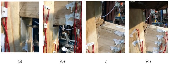 For specimen BS1, at the initial stage of loading, the tenon and the mortise were slightly deformed by mutual compression (Figure 14a). After unloading, there was no significant residual deformation of the tenon and the mortise, and the joint was basically in an elastic state. As the control displacement increased, a local fracture layer occurred at the top of the inner tenon neck of the column due to severe deformation under forward loading, the bottom fiber of the tenon neck suddenly pulled off and a wide transverse crack was formed under reverse loading (Figure 14b), while the top of the tenon and the edge of the inner mortise of the column extruded from each other to produce significant plastic deformation. As the load further increased, the fiber at the top of the tenon neck suddenly pulled off, and a clear transverse crack was generated (Figure 14c). As the loading continued, when the crack at the top of the tenon neck was large and extended to the wooden peg, tensile damage occurred (Figure 14d), and the joint failed.