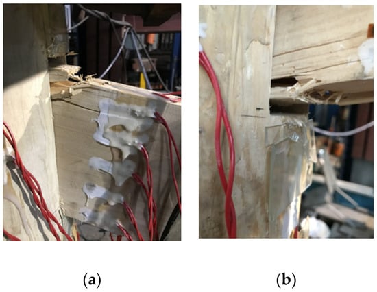 For specimens BS2–BS3, the test phenomenon at the beginning and middle stage of loading was similar to that of specimen BS1, but the final failure mode of each specimen is different. Transverse cracks were generated at the upper end of the beam tenon of specimen BS2 under tension, resulting in the ultimate tensile crack failure along the grain (Figure 15a). The lower part of the beam tenon of specimen BS3 was extruded to generate transverse cracks, which eventually led to the fracture of the specimen (Figure 15b). After failure, the test load decreased rapidly, the specimen lost the ability to continue bearing, and the test loading was terminated. Although the cracks in specimens BS2 and BS3 did not appear at the same time and location, they both extended finally to the wooden peg, with a failure mode similar to that of BS1.