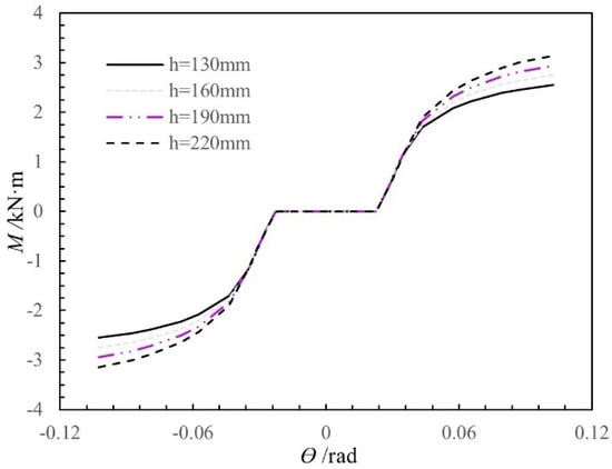 In the analysis, the standard model has the following parameters: a beam height of 160 mm, a beam width of 50 mm, a column diameter of 180 mm, and a gap of 2 mm between the tenon and the mortise. Figure 17 shows the moment-rotation curves calculated using the theoretical moment-rotation model for different beam heights (130 mm, 160 mm, 190 mm, and 220 mm), with the other influencing factors held constant. Before the joint yields, changing the beam height does not significantly influence the rotational stiffness and the moment; however, after the joint yields, the rotational stiffness and the moment of the joint both increase as the beam height increases. The influence of the beam height factor on the moment and stiffness of the joint before and after yielding is inconsistent because, as the beam height increases, the increases in the compression height and the compression length calculated from Equations (6) and (7), respectively, are greater after joint yielding than before joint yielding. As a result, the increase in the moment is also greater after joint yielding than before joint yielding, so the rotational stiffness and the moment increase significantly after joint yielding as the beam height increases.