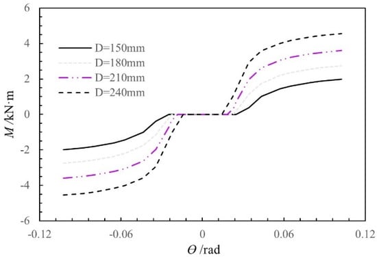 The moment-rotation curves were calculated using the theoretical moment-rotation model for different column diameters (150 mm, 180 mm, 210 mm, and 240 mm), with the other influencing factors held constant. As shown in Figure 18, as the column diameter increases in the range of 150–240 mm, the initial stiffness and moment of the SMTJ/WP increase, while the free rotation gradually decreases.
