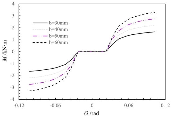Figure 19 shows the moment-rotation curves obtained using the theoretical moment-rotation model for different beam widths (30 mm, 40 mm, 50 mm, and 60 mm), with the other influencing factors held constant. The rotational stiffness and moment of the SMTJ/WP increase as the beam width increases from 30 mm to 60 mm because an increase in the beam width causes an increase in the extrusion contact area, which leads to an increase in the resultant extrusion force and friction, thereby causing the rotational stiffness and moment of the joint to increase as the beam width increases.