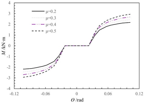 According to the Reference [26], the sliding friction coefficient between wood, μ, is in the range of 0.10–0.65. Based on the standard model, the influence of μ on the moment-rotation relationship of the SMTJ/WP was analyzed by considering different μ values (0.2, 0.3, 0.4, and 0.5), with the results shown in Figure 20. Overall, changing the friction coefficient has a large influence on the moment of the joint. Before and after the joint yields, both the rotational stiffness and the moment increase as the friction coefficient increases. Locally, the increases in the rotational stiffness and moment are larger after the joint yields than before. The increases in the rotational stiffness and moment before and after the joint yields are inconsistent. because the compression between the tenon and the mortise of the joint is closer after the joint yields than before, and the compression contact area between the tenon and the mortise increases continuously, thereby significantly increasing the friction.