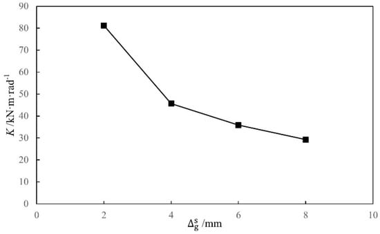 The gap between the tenon and the mortise, (assuming ), was changed to analyze its influence on the initial rotational stiffness of the SMTJ. The gap in the MTJ is assumed to be caused primarily by the shrinkage deformation of the tenon wood in the radial direction perpendicular to the grain, and the radial shrinkage deformation of the wood is generally 3–6% of the height of the tenon [21]. Therefore, based on the cross-sectional height of the tenon of the standard model, the gap was used as a parameter for analysis in this study. The influence of the gap on the initial rotational stiffness of the joint was investigated by using different values (2 mm, 4 mm, 6 mm, and 8 mm), with the influence curves shown in Figure 21. Clearly, as the gap between the tenon and the mortise increases, the initial rotational stiffness of the joint decreases because the area of the embedment zone between the tenon and the mortise decreases as the gap increases, resulting in a decrease in the rotational moment of the joint, which in turn causes the initial rotational stiffness of the joint to decrease as the gap increases.