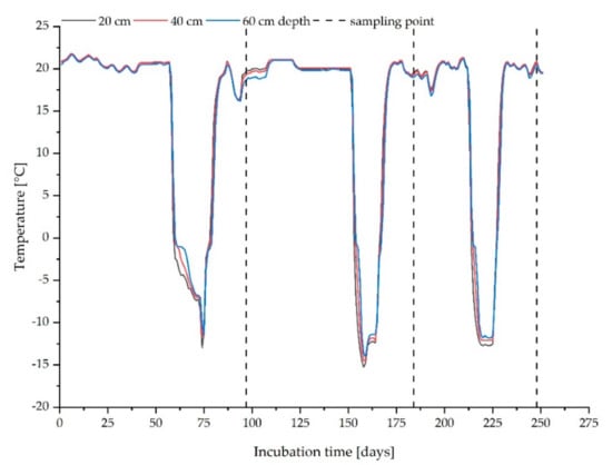 Temperature curve over the entire test period with three annual cycles, measured at 20, 40 and 60 cm distance from the edge of the reactor with treated soil ash/mixture. Dotted line marks the three sampling points after the winter phases (23 January, 24 April and 27 June).