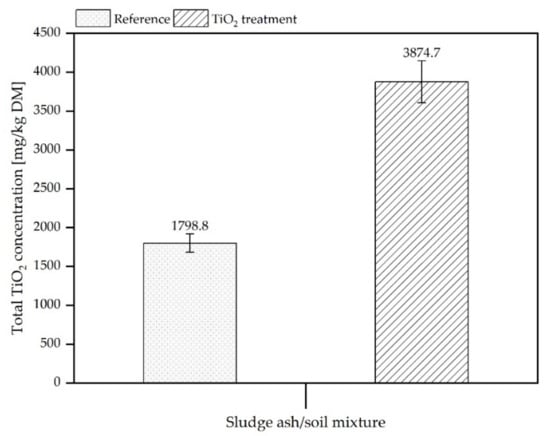 The two SSA produced differed in their titanium content as expected. For the SSA, from the reference day, an average titanium concentration of about 0.3 wt% (dry mass (DM)) with a standard deviation (SD) of 0.04 was determined, whereas the SSA treated with nTiO2 had a mean value of 2.9 wt% (DM) with an SD of 0.19 [26]. Hence, the titanium content in the nTiO2-SSA was increased compared to the reference measurement by a factor of about 9.7 [26]. Further information on characterisation of the used SSA can be found elsewhere [26].