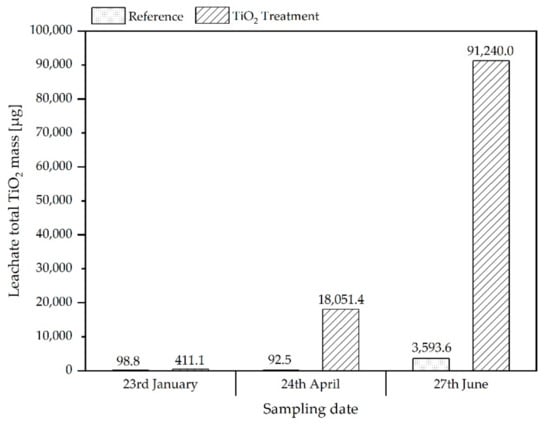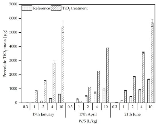 However, as shown in Figure 3, the titanium/converted TiO2 content in the leachates of treatment and reference reactors collected at the end of the three simulated annual seasonal cycles was found to be higher for the treated samples compared to the references by a factor of ~25. Titanium-containing particles are released from the treatment reactor in a significantly higher amount than expected from the total titanium content of the respective mixtures, thus, indicating that the added nTiO2 (or titanium containing particles) might be more mobilisable than the titanium-bearing particles (most likely also being TiO2) already present in the soil and sludge ash.