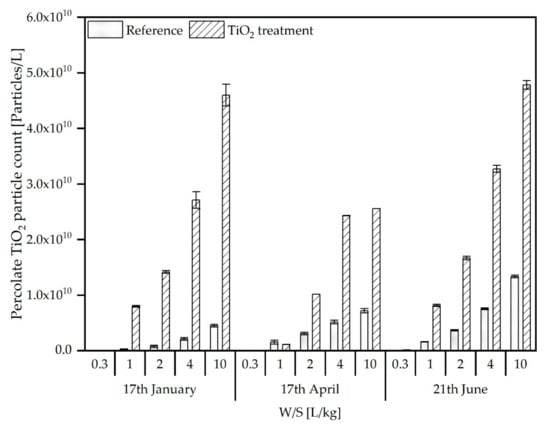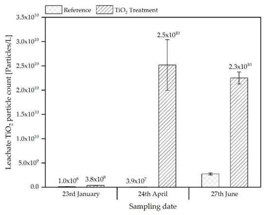 The significantly higher release of titanium in the leachates from the treatment reactor is also visible in the nanoparticle specific analysis of the leachates by spICP-MS, as shown in Figure 4. The higher TiO2 particle discharge in leachates after the first winter period (23 January) is 3.7 times higher in the treated reactor and rises to 640 times after the second simulated winter phase (17 April) and drops to 8.2 times after the third winter phase (27 June) (Figure 4). Again, the differences in discharge are much higher than could be expected from the total Ti-content determined for the soil/ash mixtures applied to the two reactors.