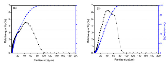 Particle size distribution of primary Fe powder and Fe/Mn0.5Zn0.5Fe2O4 core–shell structure powder (ball milled for 2h, 10%); (a) original Fe powder; (b) Fe/Mn0.5Zn0.5Fe2O4 powder.