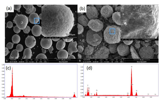 We selected the coated powder with a ball milling time of 2 h and compared it with the SEM of pure Fe powder (Figure 5). After ball milling for 2 h, the manganese Mn0.5Zn0.5Fe2O4 nano-powder is evenly coated on the surface of the Fe micro-powder, and the shape is basically spherical and quasi-spherical. This consequence is mainly due to the collision between the grinding medium and powders and between powders [16]. In addition, there is almost no crack distribution on the coated powder surface. We believe that the existence of Mn0.5Zn0.5Fe2O4 nano-powder will reduce the probability of cold welding between Fe powders, so there is almost no agglomeration [17]. Mn0.5Zn0.5Fe2O4 nano-powder acts as a process control agent in wet mechanical alloying, which is a similar role as that of benzene [18,19]. MnZn(Fe2O4)2 nano-powder can be uniformly coated on the surface of Fe powder, forming a rough-surfaced iron powder without small cracks [20].