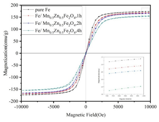 Figure 6 demonstrates the hysteresis loops of the original powder and the coated powder. The original powder and the coated powder both have high saturation magnetization (MS) and low coercivity, which are excellent soft magnetic properties. From the change in MS, the MS of the coated powder decreases continuously with the extension of the grinding time (from 1 to 4 h), but the decrease range is not obvious. MS is insensitive to the structure and mainly related to the composition of the SMCs and the properties and quantity of the ferromagnetic phase [21].