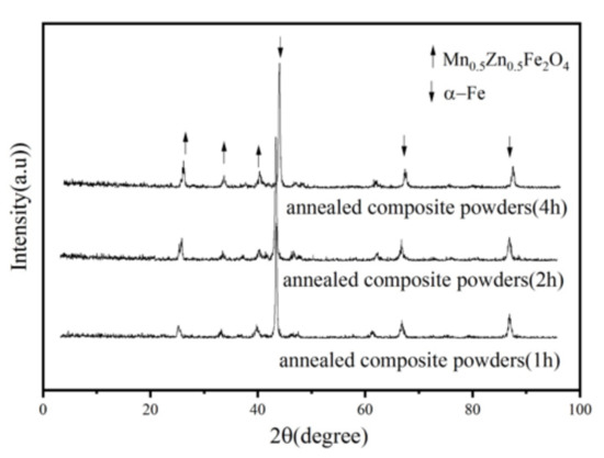 Figure 7 shows the change in coercivity of the coated powder before and after heat treatment. Clearly, the extension of the ball milling time leads to an increase in coercivity, while the coercivity of the coated powder decreases after heat treatment. On the one hand, during the grinding process, a part of the energy remains as residual stress in the material, resulting in a large number of lattice distortion and crystal defects, pinning the magnetic domain movement [22], so the coercivity increases with the extension of the ball milling time. On the other hand, the internal stress of the coated powder is released after heat treatment, which reduces the coercivity. Figure 8 shows the XRD pattern of Fe/Mn0.5Zn0.5Fe2O4 composite powders after annealing. It can be found that no phase transformation for the composite powders was identified during annealing process; the Mn0.5Zn0.5Fe2O4 phase still maintained a monoclinic structure.