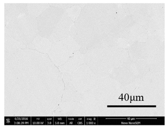 To better compare the microstructure of Fe/Mn0.5Zn0.5Fe2O4 SMCs, we studied the SEM photos of block samples prepared by SPS and the pure Fe original powder at 900 °C (Figure 11). There is almost no hole or porosity on the surface of the sample, which is very dense.