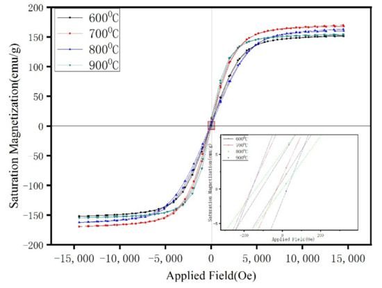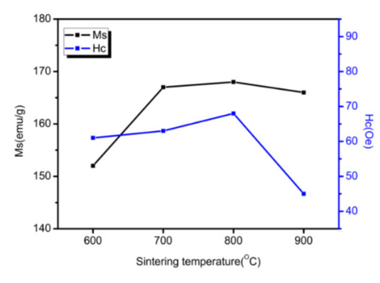 Figure 12 shows the hysteresis loops of the Fe/Mn0.5Zn0.5Fe2O4 SMCs at four temperatures. The curve shape shows the typical low coercivity and high permeability of SMCs. Data of MS and coercivity (HC) are shown in Figure 13 after sorting. After 700 °C, the sintered sample shows approximately equal MS (Figure 12), which indicates the small dependence of MS on sintering temperature in this experiment and confirms no obvious structural transformation of the Fe/Mn0.5Zn0.5Fe2O4 SMCs during sintering. However, the coercivity is obviously dependent on the sintering temperature, as it increases slightly at 600 °C–800 °C, but decreases sharply at 900 °C. We believe that with the increase in sintering temperature within 600 °C–800 °C, the Mn0.5Zn0.5Fe2O4 insulating layer causes domain wall perforation, hinders domain wall displacement and raises the energy required to complete magnetization and demagnetization, so HC increases [26]. Furthermore, Hc can increase when increasing the grain size (MnZn ferrite) as the sintering temperature increases. When the temperature reaches 900 °C, the Fe/Mn0.5Zn0.5Fe2O4 SMC is over-burned (Figure 10d), which destroys the Mn0.5Zn0.5Fe2O4 insulating layer and reduces HC.