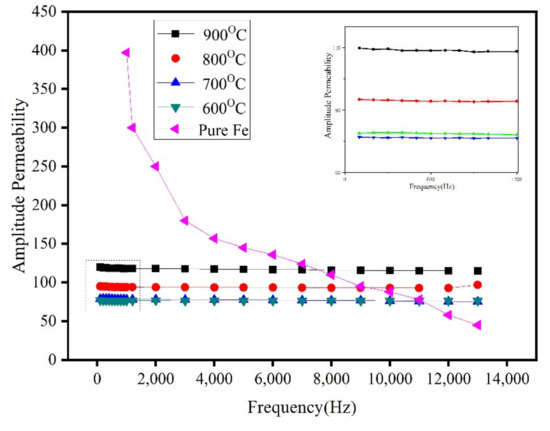 Figure 14 shows the amplitude permeability of the Fe/Mn0.5Zn0.5Fe2O4 SMCs prepared at different sintering temperatures and different frequencies. The amplitude permeability of the SMCs is stable, indicating that the ferrite insulation coating intensifies the resistivity between particles and reduces the inter-particular eddy current and the demagnetization field formed by the eddy current [27]. At a low frequency, the amplitude permeability μa of the Fe/Mn0.5Zn0.5Fe2O4 SMCs is much lower than that of the Fe alloys because μa corresponds to the slope of the initial magnetization curve and the initial permeability μi. The μi and internal stress σ in a material are inversely proportional to the impurity concentration β. In this study, due to the addition of Mn0.5Zn0.5Fe2O4, the impurity concentration β of the Fe/Mn0.5Zn0.5Fe2O4 SMCs is much lower than that of the Fe alloys.