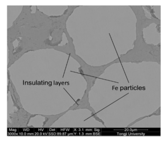 Soft magnetic composites (SMCs) refer to ferromagnetic particles coated with an insulating medium and prepared into bulk materials by powder metallurgy, expanding the working frequency of metal soft magnetic materials to the GHz level [1]. Compared with traditional metal alloys, SMCs not only maintain the excellent soft magnetic properties of the materials, but also reduce the high-frequency eddy current loss and improve the application frequency [2]. In recent years, SMCs have played the roles of energy coupling transfer and conversion in various devices [3,4]. With the intensification of energy shortage and environmental problems, reducing the loss of soft magnetic materials and improving the efficiency of the magnetic core are of great significance in saving energy and controlling environmental pollution.