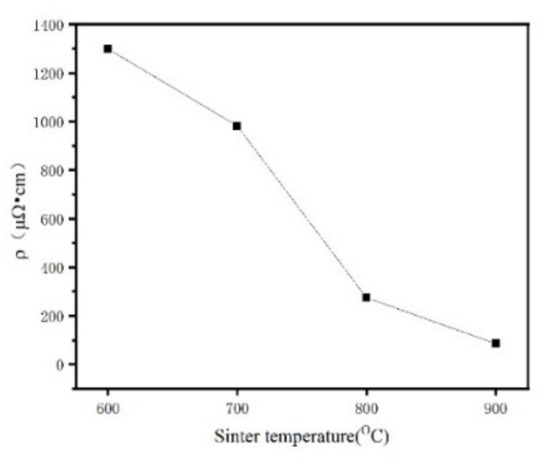 Figure 16 shows the resistivity test results of the Fe/Mn0.5Zn0.5Fe2O4 SMC sintered blocks prepared at different sintering temperatures. The resistivity of pure Fe powder is 25.47 μΩ·cm. With the increase in sintering temperature, the resistivity of the sintered block decreases from 1298.65 μΩ·cm at 600 °C down to 274.3 μΩ·cm at 800 °C. The reason is that the increasing density of the sintered blocks and the decreasing number of holes or gaps result in an intensification of electron mobility. However, with a further temperature rise, the resistivity decreases sharply to 85.5% at 900 °C. We believe that the significant change in resistance is mainly related to the percolation transition from the insulator to the conductor [28]. The Mn0.5Zn0.5Fe2O4 insulating layer is damaged, and a current conduction path is formed between some Fe powders, resulting in a sharp reduction in the resistance of sintered block materials.