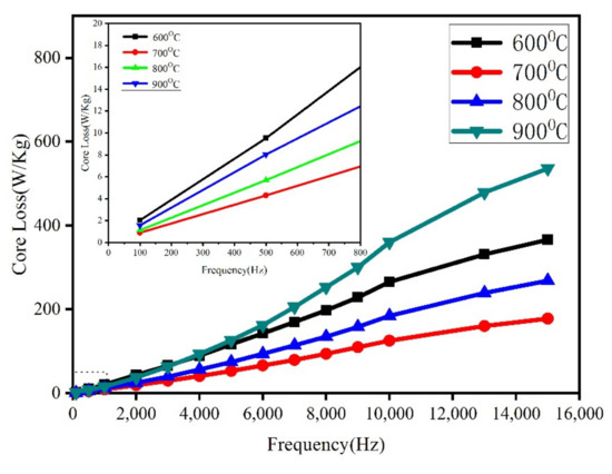 Figure 17 demonstrates the loss variation curve under different sintering temperatures. The core loss increases significantly with the increment in frequency. The lowest loss occurs at 700 °C, while the loss increases sharply at 900 °C. On the micro-morphology of the sintered sample, the insulating layer of the Fe/Mn0.5Zn0.5Fe2O4 SMCs is increasingly tightly coated at 600 °C–700 °C, and the eddy current radius is decreasing (Figure 10). Therefore, the loss decreases. When the temperature rises to 900 °C, the Fe/Mn0.5Zn0.5Fe2O4 SMC is in an over-burned state, the insulating layer is damaged, and the eddy current loss between and within particles increases, resulting in more core loss (Figure 10d).