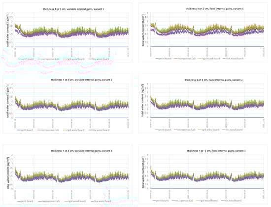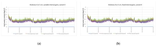 Analyses of total moisture content in the wall for individual variants were performed. Figure 1 only presents selected results for 4 or 5 cm insulation thickness for the variable and constant occupancy schedule, respectively.