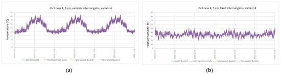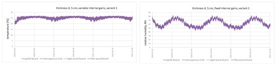 With the varying load profile for wall A (perlite board), the lowest recorded temperature value was 17.0 °C (this value was recorded with different ventilation variants V3 and V4 and different insulation thicknesses). The highest value is 39.8 °C for variant V4 with 12 cm of insulation. For wall B (microporous Ca-Si), the lowest value was 16.9 °C, while the highest was 39.9 °C. For walls C (rigid wood fibreboard) and D (flex wood fibreboard), the values were 16.5 °C and 17.0 °C, and 39.3 °C and 39.8 °C, respectively. The highest values of minimum temperature were recorded for ventilation variants V1 and V2, while the lowest for variant V4. Conversely, in the case of maximum values, the opposite applies, where the highest values of maximum temperature on the inner surface were recorded for variant V4 and the lowest for variant V1. There were no significant differences between the obtained temperature values for the different variants of wall system solutions with the same ventilation and insulation variants. A minimal increase in temperature values in the range of 0.05–1 °C can be observed depending on the ventilation variant with increasing insulation thickness. For variants V1 and V2, the average minimum temperature on the inner surface was 19.5 °C and the maximum was 27 °C. On the contrary, for variants V3 and V4, the average minimum temperature was 16.54 °C, whereas the maximum for variant V3 does not differ from variants V1 and V4, and is 39.3 °C. Lower temperature for variant V3 is the result of more intensive ventilation, while higher temperature for variant V4 is the result of the absence of a cooling option for this variant.