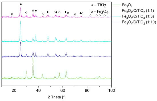 This pattern corresponds to the cubic structure of Fe3O4 (Fd-3m space group), with the lattice constants of a = b = c= 8.374 Å. Materials modified with titanium dioxide had characteristic reflexes at the angles of 25.26, 37.84, 47.89, 54.89, 62.93 and 75.41, which correlated with the crystallographic planes of [101], [103], [200], [105], [204] and [215], typical of the anatase phase with tetragonal structure with the lattice constants of a = 3.79 Å, b = 3.79 Å, and c = 9.41 Å (ICDD:01-075-2550). The material with the magnetite to titanium dioxide molar ratio of 1:3 displayed a higher intensity of reflexes coming from anatase phase. This provides evidence that the anatase phase constituted a larger part of the material than the sample with the molar ratio of 1:1. Fe3O4/C/TiO2 (1:10) material was characterized by a lower intensity of reflexes coming from anatase phase, compared to other materials modified with titanium dioxide. The increase in the amount of TiO2 precursor to 10 mL did not increase the intensity of the anatase phase reflex.