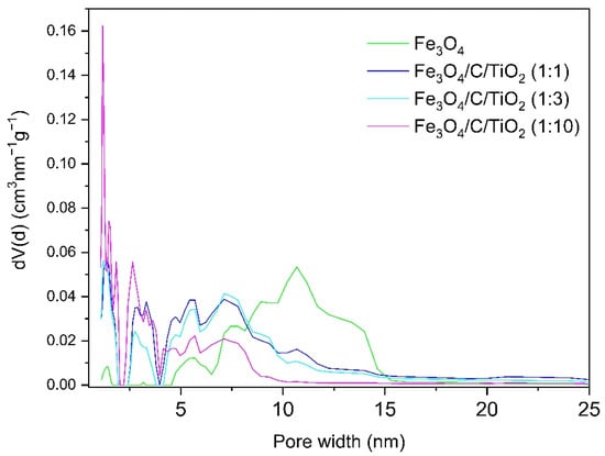 Figure 2 shows the pore size distribution of pure magnetite (Fe3O4) and magnetite modified with titanium dioxide in different molar ratios (Fe3O4/C/TiO2). Nanocrystalline magnetite is a mesoporous material, with a pore size in the range of 5–15 nm [12]. The modification with titanium dioxide caused the pore size to decrease. The mesopores in modified materials had a size between 2 and 10 nm. As the amount of titanium dioxide increased, the share of mesopores decreased and that of micropores below 2 nm increased.