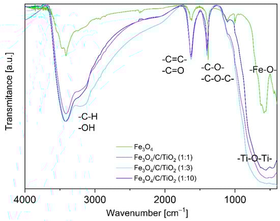 Figure 3 shows FT-IR spectra of magnetite covered with a carbon layer (Fe3O4) and magnetite modified with varied amounts of titanium dioxide. A broad band with a wavelength of approximately 3500 cm−1 was observed. This was ascribed to the stretching vibration corresponding to the presence of hydroxyl groups (OH) coming from water adsorbed on the surface [16,17].