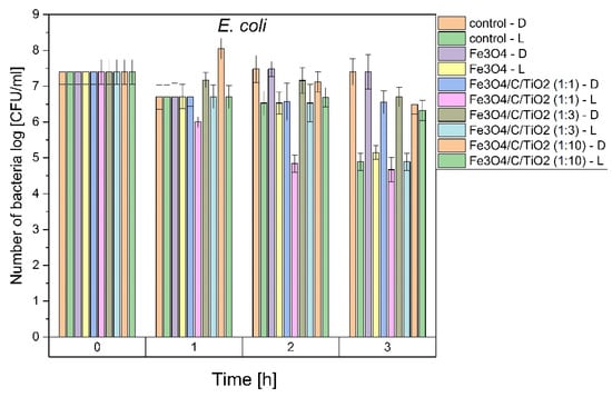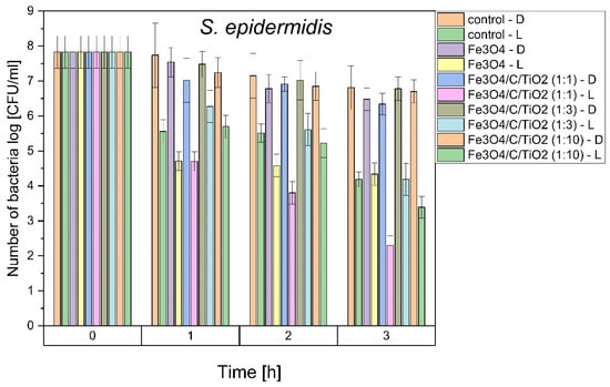 In order to explore the antibacterial activities of synthesized Fe3O4/C/TiO2 materials, the Gram-negative bacterium Escherichia coli K12 (ATCC 25922, Manassas, VA, USA) and the Gram-positive bacterium Staphylococcus epidermidis (ATCC 4946, Manassas, VA, USA) were used. The bacterial isolates were cultured overnight in nutrient broth (BioMaxima S.A., Lublin, Poland) for E. coli and Brain Heart Infusion Broth BHI (BioMaxima S.A., Lublin, Poland) for S. epidermidis at 37 °C and 120 RPM in a rotary shaker. After centrifugation (4000 RPM, for 10 min), the bacterial cultures were diluted with saline (0.85% NaCl) or Phosphate-buffered saline (PBS, Chemland, Stargard, Poland), sterile buffers suitable for bacteria species. The final concentration of working bacterial dilution was 0.5 in McFerland standard (bioMérieux, Warsaw, Poland), approximately 1.8 × 108 CFU/mL. The tests were conducted in a 100 mL sterilized glass container containing bacterial suspension (1 mL working solution containing the bacteria) and 0.1 g/dm3 of the Fe3O4/C/TiO2 rotating at 200 RPM. The suspension was irradiated with a lamp emitting artificial solar light UV-Vis (ULTRA-VITALUX 230V E27/ES, OSRAM 300W) or kept in the dark (control experiment) at 37 °C. The distance between the solution and the light source was fixed at ca. 15 cm. Serial dilutions (10−1 to 10−6) were prepared in a saline solution (0.85%) after 1, 2 and 3 h. Then, 0.5 mL of the solutions was cultured on an agar plate and placed on Plate Count Agar (PCA agar, BTL, Lodz, Poland) for E. coli or Brain Heart Agar for S. epidermidis. Agar plates were incubated at 37 °C overnight, and then the bacterial colonies were counted to calculate the colony-forming unit/mL (CFU/mL). All cultures were repeated three times. Control experiments for bacterial suspensions were also conducted.