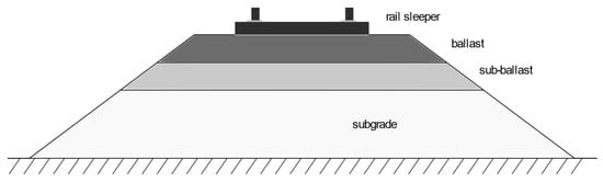 The purpose of the substructure (subgrade) is to transfer loads without permanent deformation to the subsoil from passing rail vehicles, the weight of the rail itself and the layers above it. The subgrade usually consists of natural soil and a thin layer of additional soil material, which is required to provide the planned track path. A typical embankment substructure is shown in Figure 1, where the superstructure layers, i.e., ballast and subballast, are placed on top of the original soil, on which the railway road is placed.