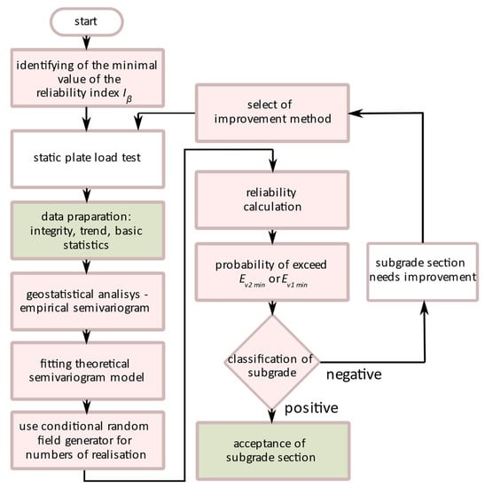 A method of implementation of these very general reliability suggestions in the design practice is shown by the algorithm in Figure 2. After determining the section of the substructure to be assessed and identifying of the class of the section according to the adopted classification, the minimal value of the reliability index beta (Table 4) for the substructure is obtained. The iterative procedure starts with the first in situ tests of the substructure performed with a static plate load test. In the next step, geostatistical analysis is carried out to obtain theoretical semivariograms for the elastic properties of subsoil in the section. Using the procedure described previously, a conditional random field is repeatedly generated for points spaced at a certain distance from each other, corresponding to the distance between the railway axes. It is described by a determined geostatistical relation. European or national standards allow the adoption of an objective criterion to disqualify a test point. In the proposed procedure, the minimum value of Ev1 or Ev2 is taken as a criterion. For the points and for the whole section, the number of exceedances of the failure condition is tested, e.g., by the Crude Monte Carlo (CMC) method. It allows for the determination of the probability of not fulfilling the adopted objective criterion of the substructure quality. If the reliability index for a point or a section is higher than expected, it means that the execution is correct and further track works can be carried out. Otherwise, improvement works should be carried out in the area where the objective criterion is not met with a given probability. Once the additional tests confirm the quality of the modified subgrade are completed, the calculation procedure shall be repeated. The whole process is continued until approval is obtained at all points specified.