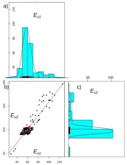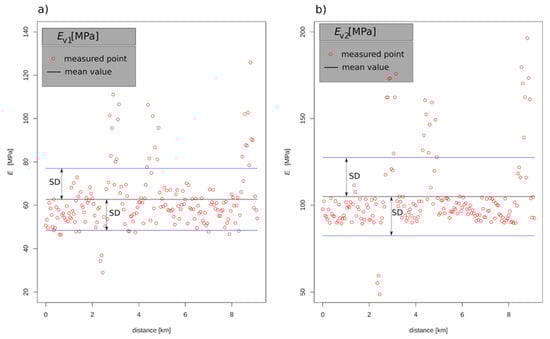 A series of static plate load tests were performed on the investigated section according to the Polish guidelines [30]. A total of 183 tests were carried out at 50 m spacing. The results are shown in Figure 3 and Table 5. The values of the Ev1 modulus range from 28.99 to 125.90 MPa with a mean value of 62.68 MPa and a standard deviation of 14.29 MPa. The values of the Ev2 modulus range from 48.70 to 196.50 MPa with a mean value of 104.99 MPa and a standard deviation of 22.53 MPa. As can be observed in Figure 3, the vast majority of results are within the ±1 standard deviation range. In order to better illustrate the results obtained, Figure 4 presents histograms of the values of the modules Ev1 and Ev2 (Figure 3a,c) and their correlation (Figure 3b). In this configuration, the linear correlation between the parameters can be seen, as well as points of particular concern with small values of the moduli. The red point in Figure 4b is the mean value and the red line is a line fitted by the least-squares method. The concentration of points in one group (Figure 4b) results from a strong mutual correlation of the measurements as understood by Pearson. The closer to the line Ev1 = Ev2, the greater the degree of correlation. The correlation between Ev1 and Ev2 values is significant and equal to 0.92. When the variability of a parameter is high, it is suggested to separate sections which can be approximated by a linear trend.