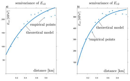 Based on the results of the field study, empirical and theoretical semivariograms were established according to the procedure described in Section 2.2. Figure 5a,b show semivariograms of stiffness values measured in situ with fitted theoretical models. In the two cases studied, an exponential model [50] from Table 1 combined with a nugget effect was used to describe the variability. The results are presented in Table 6. The geostatistical models reproduce a powered exponential covariance structure with a significant randomness of the measured values, as evidenced by the value of high nugget effects (14–33%).