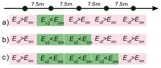 Diagram of reliability test points (7.5 m sections) and possible variants of non-achievement of criterion: (a) single point—7.5 m—Mode(7.5); (b) two adjacent points—15.0 m—Mode(15), (c) three adjacent points—22.5 m—Mode(22.5).