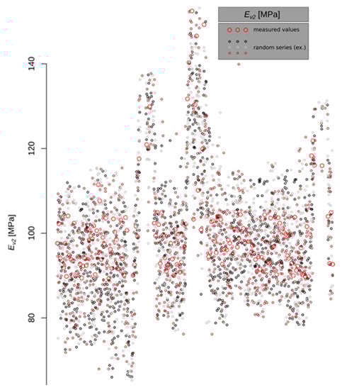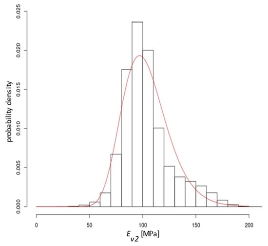 The results of the sample draws are shown in Figure 7. The red circles correspond to the measured values. The black, brown and grey points represent successive realisations of the random process conditioned by the measured values of Ev2. For the studied section 107 draws were executed. Due to the very large number of points for the set of stiffness distributions, the results are presented as a histogram (Figure 8). The statistical description is presented in Table 7. A log-normal probability distribution with parameters m = 4.61899 and s = 0.2080448 was fitted to the histogram using the maximum-likelihood method. The log-normal cumulative distribution function with the determined parameters is the basis for further calculations of the failure probability.