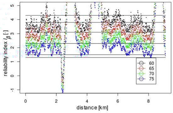 The calculated values of the reliability index Iβ for the full length of the investigated line for the modulus Elim = 60, 65, 70 and 75 MPa.