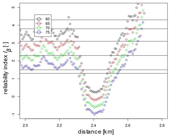 The calculated values of the reliability index Iβ for the 2.0–2.8 km section of the investigated line for the modulus Elim = 60, 65, 70 and 75 MPa.