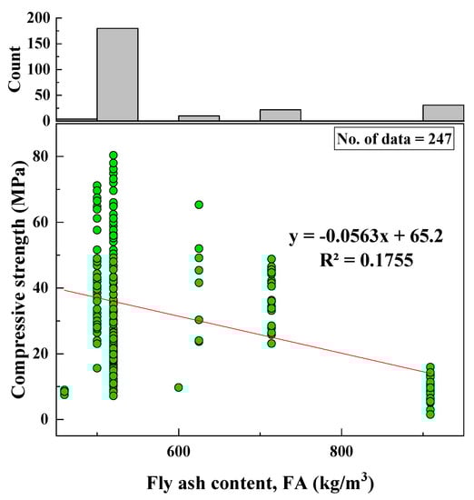 The types of fly ash used to prepare geopolymer mortars were classes F and C, according to the 247 datasets collected. The range of content was 460 to 909 kg/m3, with a median of 520 kg/m3. The standard deviation (SD) was 136.64 (kg/m3), the variance was 18,670.26 (kg/m3), and the skewness and kurtosis were 1.64 and 1.16, respectively. Figure 2 shows the FA/CS relationship; the histogram for FA content is also presented.
