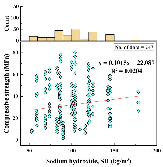 NaOH content of the mixes varied between 53 and 179 kg/m3. The SD, variance, skewness, and kurtosis values were 25.84, 667.89, 0.47, −0.11, respectively. The histogram of NaOH content and the relationship of NaOH content with CS can be seen in Figure 6.