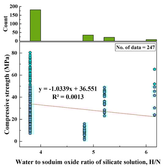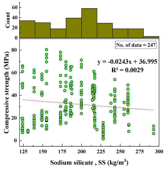 Based on the data collected, the added Na2SiO3 content was in a range from 124 to 293 kg/m3. The SD, kurtosis, variance, and skewness values were 40.87, −0.84, 1670.7, −0.02, respectively. The variation of SS with the CS and the histogram of SS are shown in Figure 7.