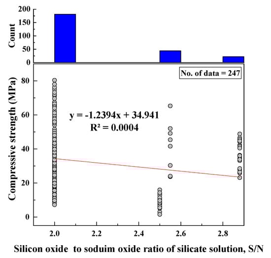 SiO2/Na2O ratio ranged from 2 to 3 with an SD of 0.3, variance of 0.09, kurtosis of 0.46, and skewness of 1.4. A histogram for SO/N was created, and its relationship with CS was represented, as shown in Figure 8.