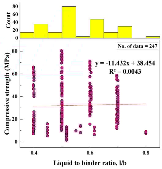 The liquid-to-binder ratio varied from 0.4 to 0.8 based on the total data collected; additional water was included. The SD, variance, skewness, and kurtosis were 0.1, 0.01, 0.36, and −0.76, respectively. A histogram of l/b frequency and the variation of l/b with CS are shown in Figure 10.