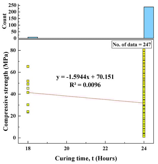 Another essential parameter that affects the CS of geopolymer composites is the curing period of geopolymer specimens inside ovens. Based on 247 datasets collected from the literature, it was found that geopolymer specimens were rested inside ovens for between 18 and 24 h, with an SD of 1.13, variance of 1.27, skewness of −4.98, and kurtosis of 22.97. A histogram of curing time and the relationship between CS and curing time are shown in Figure 13.